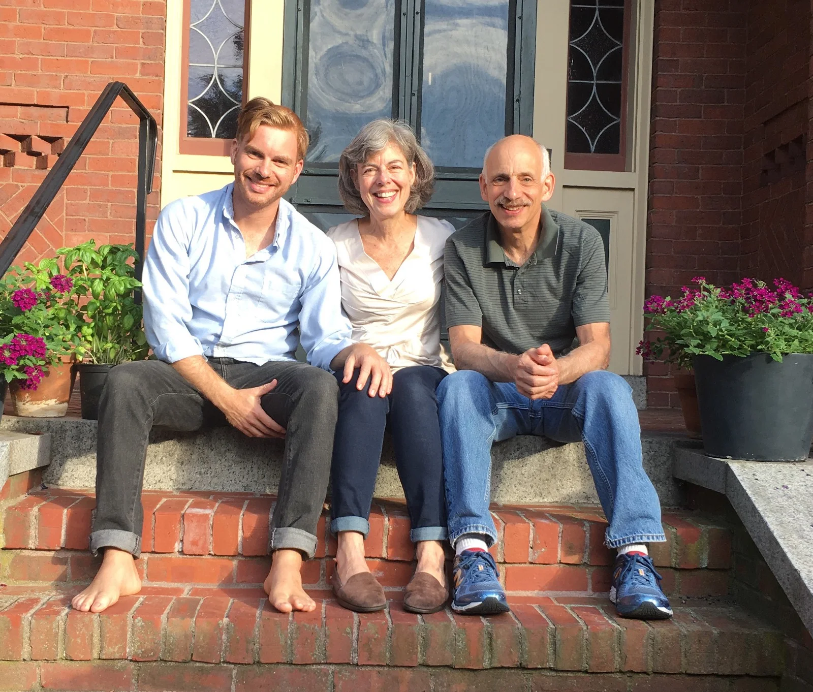 Hanging with mom and dad on the front steps, post op hair style in full effect
